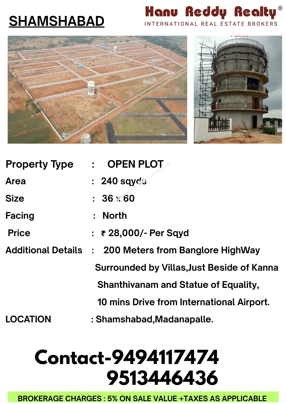 | Property Description: Plot For Sale at Madanpally, Shamshabad, Rangareddy total 240 240 Sq.yds Plot Available for sale Plot facing is north Demounction are 36X60 beauitful Gated Community project almost vills are going on best at adavntage of the plot just 200mts from bangalore Highway prime location surrounding |